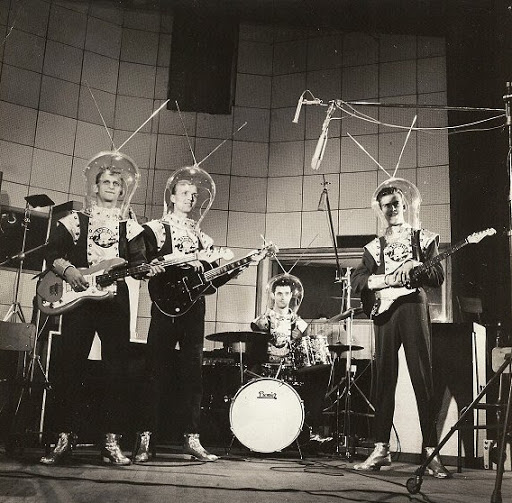 Puis vinrent les suédois The Spotnicks habillés en cosmonautes de la tête aux pieds ! De l’autre côté de l’atlantique, ce sont The Ventures qui triomphent aux USA avec le titre « Walk, don’t run » (1960) annonçant la vague de surf music à venir.