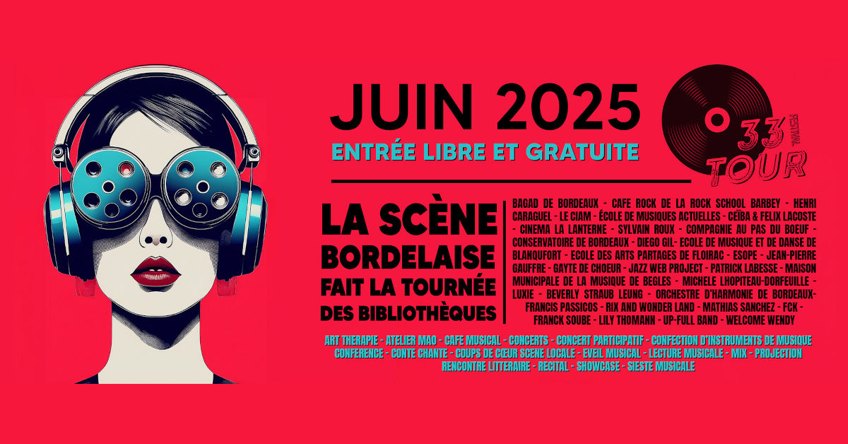 Du 1er au 30 juin, la scène musicale girondine est mise à l’honneur dans les bibliothèques de la métropole bordelaise durant le festival 33 TOUR ! Pour sa 5ème édition, 37 évènements sont au programme de ce rendez-vous annuel ! Entrée libre et gratuite !