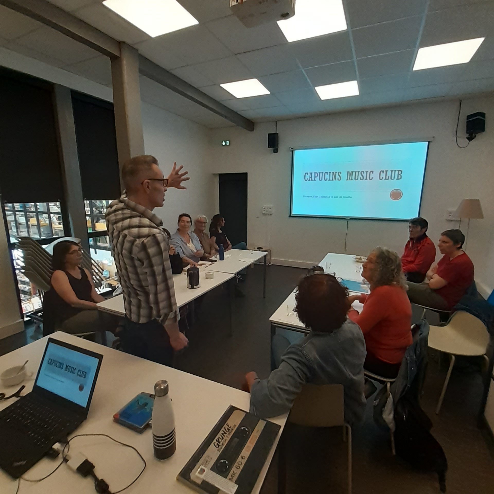 En ce samedi 08 juin, le thème abordé est Kurt Cobain en raison de l’anniversaire de sa disparition et plus largement le grunge. Extraits musicaux, extraits vidéos se succèdent durant lesquels notre homme assoit son savoir sans jamais écraser les personnes présentes, répondant à chacune de leur interrogation avec une maestria bien rôdée.  Et comme il le revendique parfois aussi, avec ce qu’il faut de mauvaise foi  ! Il faut dire qu’il les connait à forcer les fréquenter. On est même surpris du lien presque indéfectible qui s’est noué avec le temps entre notre collègue et certains usagers. Pour preuve ? Les références multiples de certain(e)s d’entre eux /elles à d’anciens thèmes abordés auparavant.  Et quand, à l’heure de la photo de groupe, il a fallu convaincre notre collègue de passer devant l’objectif l’assemblée dans son entièreté fit preuve d’une belle abnégation pour le convaincre de rompre avec sa légendaire discrétion. La preuve était faite !
