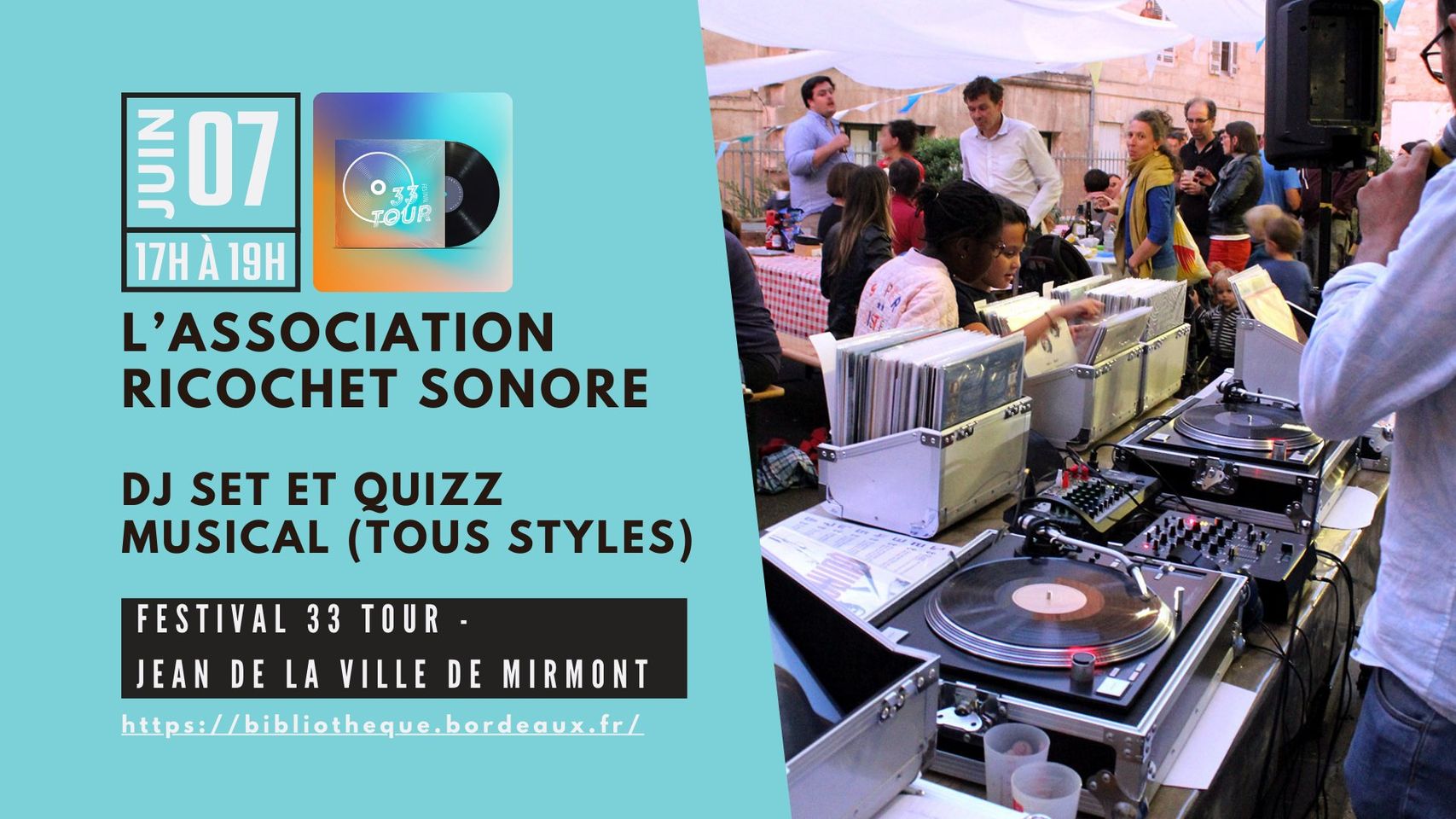 Rencontre avec Arnaud PECASTAING, Chargé de Mission et de Communication de l’association Ricochet Sonore, afin d’en savoir un peu plus sur le DJ Set et Quizz musical que l’association donnera le mercredi 07 juin de 17h à 19h sur la place de l’Eglise Saint-Augustin à la bibliothèque de Bordeaux Jean de La Ville de Mirmont  dans le cadre du festival 33 Tour.